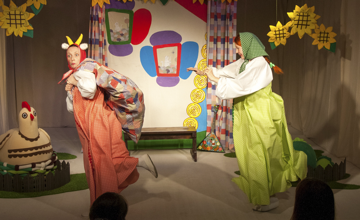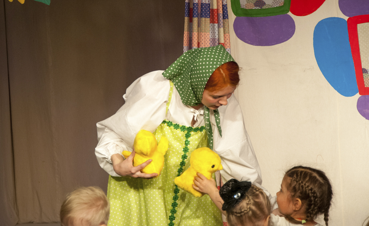 Первая часть проходит в зале, где ребятишки смотрят спектакль. Во время спектакля детей часто вызывают на сцену поучаствовать в действии.Во второй части представления детки идут на мастер-класс, делать открытку.